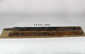 Spatha in ferro a doppio taglio, lama lunga e sottile con codolo a sezione quadrata.