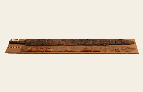 Spatha in ferro a doppio taglio, lama lunga e sottile con codolo a sezione quadrata.