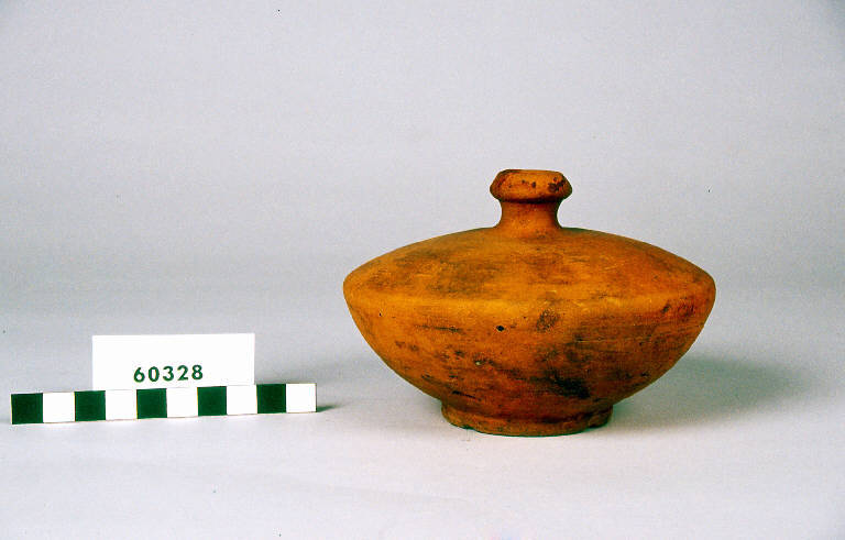 Vaso a trottola di forma schiacciata, spalla posta a metà dell' altezza, collo corto e stretto