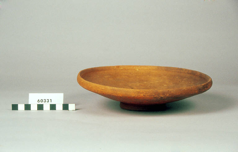 Patera di forma ampia, corpo a pareti dritte, orlo arrotondato e leggermente introflesso.