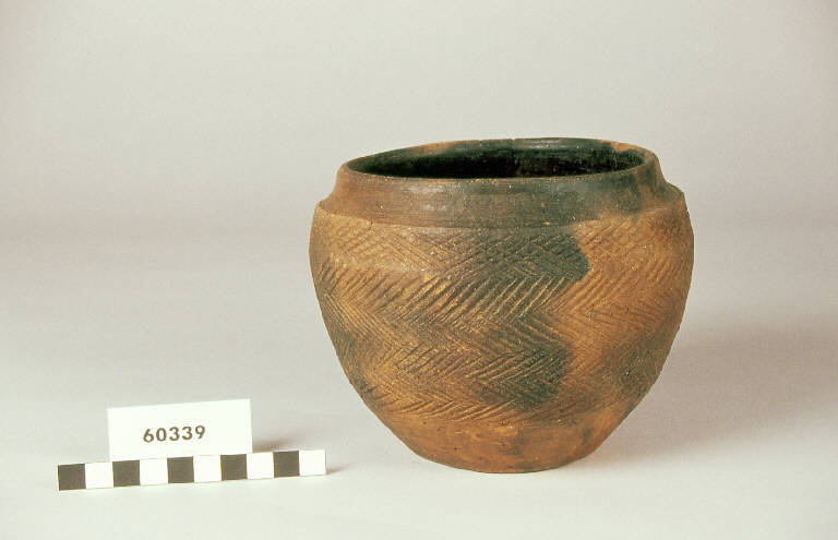 Olletta di forma troncoconica, una strozzatura al punto di giunzione tra orlo e pareti, fondo piatto e orlo obliquo.