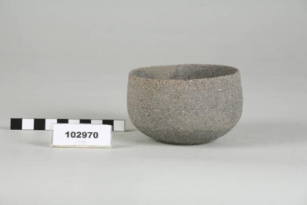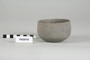 Coppetta emisferica a pareti sottili con bordo leggermente inclinato verso l'interno, orlo arrotondato e basso piede a disco.