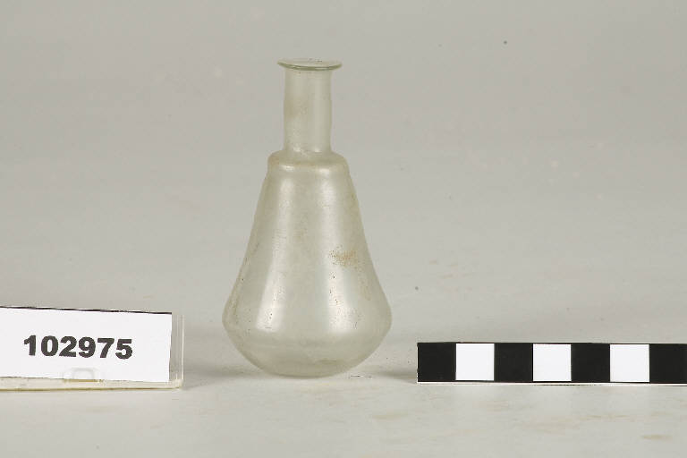 Balsamario di colore blu piriforme, bordo distinto, labbro estroflesso e ventre conico
