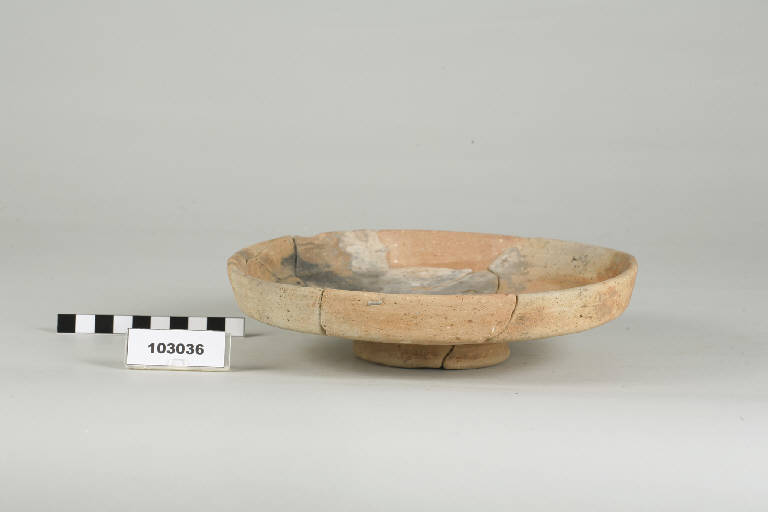 Patera a bordo obliquo verso l'interno, orlo arrotondato e piede ad anello.