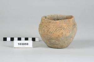 Olletta ovoide con breve bordo dritto, fondo piano, apoda.