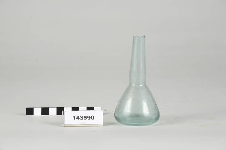 Balsamario con corpo globulare allungato, alto collo svasato, labbro esoverso, fondo piano.
