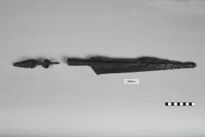 Cuspide di lancia con innesto a cannone, lama con una accentuata nervatura mediana.