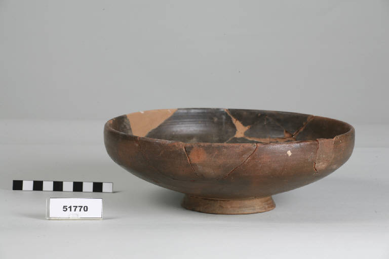 Ciotola con vasca a parete convessa, breve orlo verticale a profilo indistinto, basso piede ad anello.
