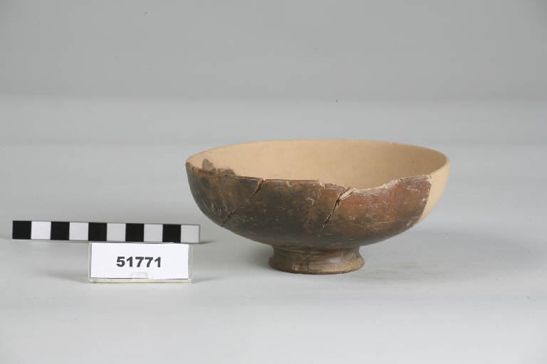 Piccola ciotola con vasca a parete convessa, fondo piatto su basso piede ad anello.