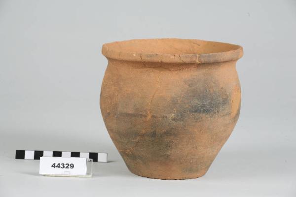 Olla ovoide con orlo estroflesso, labbro verticale e fondo piano.