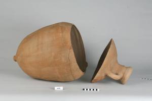 Anfora segata con orlo ad imbuto, labbro introflesso, anse a profilo arrotondato terminanti sulla spalla e corpo ovoide.