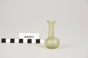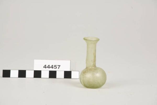 Balsamario in vetro con orlo estroflesso, collo cilindrico e fondo convesso.
