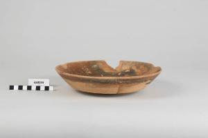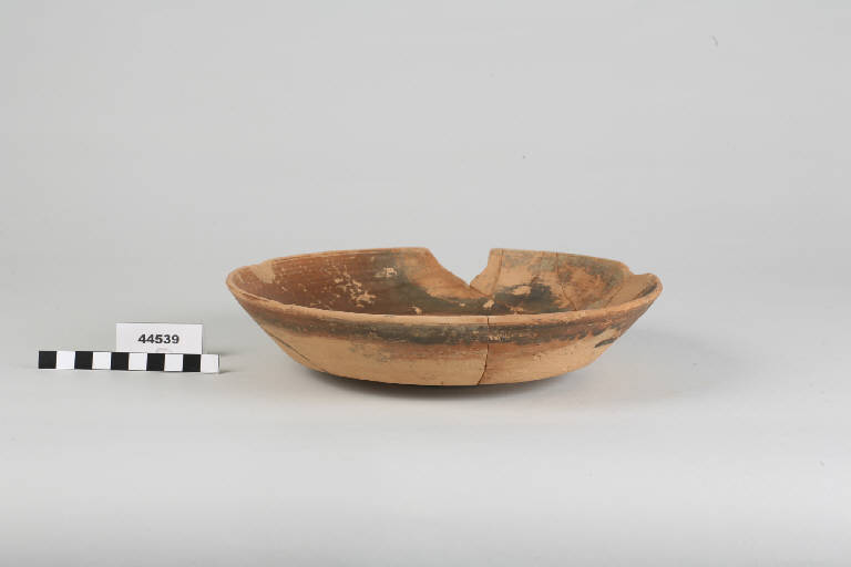 Patera in terra sigillata con orlo arrotondato, parete obliqua e piede ad anello.
