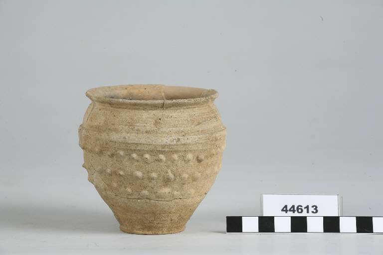 Olletta ovoide con orlo estroflesso e accenno di piede a disco.
