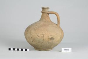 Olpe a collarino con corpo schiacciato, labbro a sezione triangolare, collo troncoconico e piede ad anello.