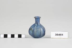 Balsamario con orlo estroflesso, breve collo cilindrico, corpo quasi piriforme, vetro blu con bolle.