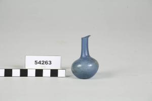 Balsamario in vetro blu, orlo estroflesso tagliato e arrotondato, corpo globulare e fondo piano.