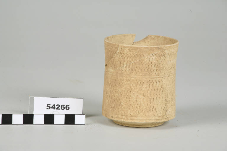 Bicchiere cilindrico a pareti sottili, orlo arrotondato e piede a disco.