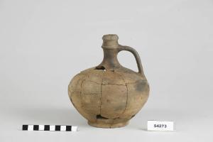 Olpe con collo cilindrico, piede ad anello ed ansa a quattro costolature.