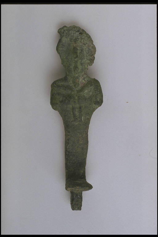 - NOTIZIE STORICO CRITICHE L'opera fa parte della raccolta egizia Giuseppe Acerbi (Castelgoffredo 1773 - 1846), costituita da reperti archeologici selezionati dall'erudito e scienziato naturalista mantovano - nominato nel 1826 Console Generale d'Austria in Egitto - tra Alessandria e Assuan, nella seconda metà degli anni Venti del XIX secolo. Entrata a far parte ufficialmente delle collezioni comunali di Mantova con il lascito di Agostino Zanelli, nipote ed unico erede dell'Acerbi, nel 1876, la raccolta ha conosciuto differenti collocazioni nel corso del tempo, fino all'attuale.\nL'esemplare é compreso nel gruppo di statuette votive - prevalentemente in bronzo - tipiche del periodo compreso tra la XXVI dinastia e l'età tolemaico-romana e rappresentanti l'intero pantheon egizio. Il dio Osiride, con caratteristico copricapo e insegne regali rette dai pugni sul petto, è rappresentato secondo la tipologia del Medio Egitto. Sul corpo piatto emergono gli attributi: a sinistra il flagello, a destra lo scettro.
