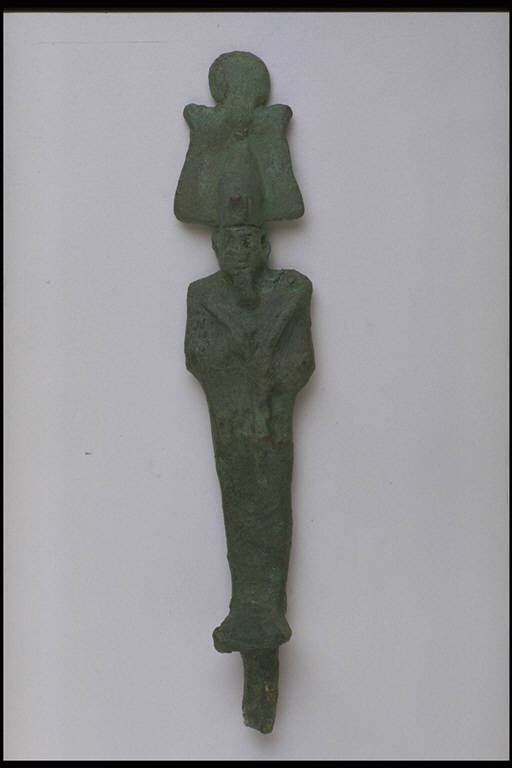 - NOTIZIE STORICO CRITICHE L'opera fa parte della raccolta egizia Giuseppe Acerbi (Castelgoffredo 1773 - 1846), costituita da reperti archeologici selezionati dall'erudito e scienziato naturalista mantovano - nominato nel 1826 Console Generale d'Austria in Egitto - tra Alessandria e Assuan, nella seconda metà degli anni Venti del XIX secolo. Entrata a far parte ufficialmente delle collezioni comunali di Mantova con il lascito di Agostino Zanelli, nipote ed unico erede dell'Acerbi, nel 1876, la raccolta ha conosciuto differenti collocazioni nel corso del tempo, fino all'attuale.\nL'esemplare é compreso nel gruppo di statuette votive - prevalentemente in bronzo - tipiche del periodo compreso tra la XXVI dinastia e l'età tolemaico-romana e rappresentanti l'intero pantheon egizio. Il dio Osiride, con caratteristico copricapo e insegne regali rette dai pugni sul petto, è rappresentato secondo la tipologia del Basso Egitto. Modellato e proporzioni scarsamente curati.