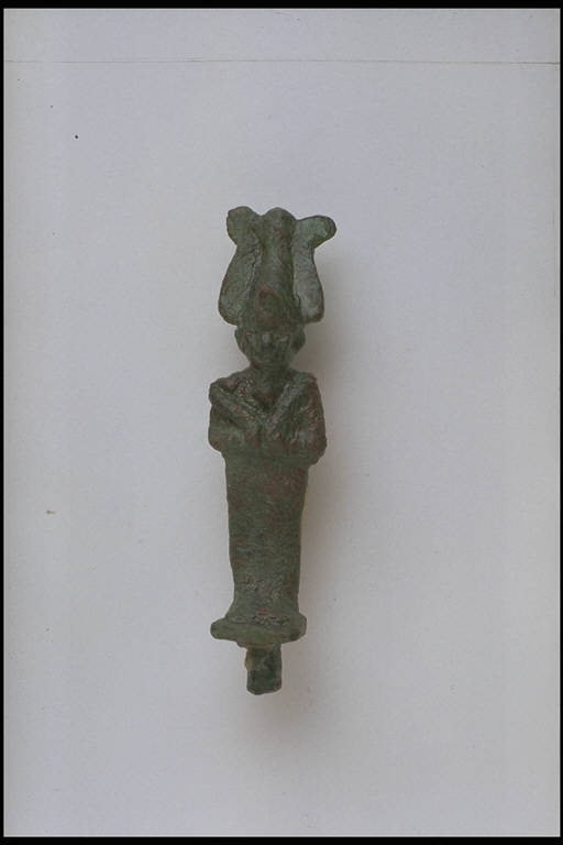 - NOTIZIE STORICO CRITICHE L'opera fa parte della raccolta egizia Giuseppe Acerbi (Castelgoffredo 1773 - 1846), costituita da reperti archeologici selezionati dall'erudito e scienziato naturalista mantovano - nominato nel 1826 Console Generale d'Austria in Egitto - tra Alessandria e Assuan, nella seconda metà degli anni Venti del XIX secolo. Entrata a far parte ufficialmente delle collezioni comunali di Mantova con il lascito di Agostino Zanelli, nipote ed unico erede dell'Acerbi, nel 1876, la raccolta ha conosciuto differenti collocazioni nel corso del tempo, fino all'attuale.\nL'esemplare é compreso nel gruppo di statuette votive - prevalentemente in bronzo - tipiche del periodo compreso tra la XXVI dinastia e l'età tolemaico-romana e rappresentanti l'intero pantheon egizio. La figura del dio Osiride vi é rappresentata secondo la tipologia del Medio Egitto, benché i gomiti siano poco sporgenti rispetto al corpo dritto e scarsamente modellato.
