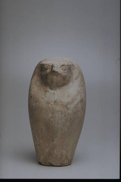 - NOTIZIE STORICO CRITICHE L'opera fa parte della raccolta egizia Giuseppe Acerbi (Castelgoffredo 1773 - 1846), costituita da reperti archeologici selezionati dall'erudito e scienziato naturalista mantovano - nominato nel 1826 Console Generale d'Austria in Egitto - tra Alessandria e Assuan, nella seconda metà degli anni Venti del XIX secolo. Entrata a far parte ufficialmente delle collezioni comunali di Mantova con il lascito di Agostino Zanelli, nipote ed unico erede dell'Acerbi, nel 1876, la raccolta ha conosciuto differenti collocazioni nel corso del tempo, fino all'attuale.\nL'oggetto riproduce l'usuale forma esterna del vaso canopo con coperchio, ma in questo caso la testa di falco è unita al corpo del contenitore, internamente pieno. Le sue dimensioni sono leggermente ridotte rispetto ai vasi canopi veri. Tratti di pittura nera si intravvedono in corrispondenza del becco, degli occhi e della parrucca, a integrazione di un modellato piuttosto sommario.