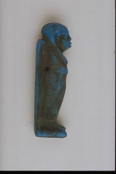 - NOTIZIE STORICO CRITICHE L'opera fa parte della raccolta egizia Giuseppe Acerbi (Castelgoffredo 1773 - 1846), costituita da reperti archeologici selezionati dall'erudito e scienziato naturalista mantovano - nominato nel 1826 Console Generale d'Austria in Egitto - tra Alessandria e Assuan, nella seconda metà degli anni Venti del XIX secolo. Entrata a far parte ufficialmente delle collezioni comunali di Mantova con il lascito di Agostino Zanelli, nipote ed unico erede dell'Acerbi, nel 1876, la raccolta ha conosciuto differenti collocazioni nel corso del tempo, fino all'attuale.\nL'amuleto rientra in un cospicuo gruppo di oggetti analoghi per tipologia e funzione (apotropaica/magica) e, tra questi, nella serie di amuleti raffiguranti divinità. Il dio lunare Khensu - l'astro che sempre scompare e ritorna - é rappresentato in forma umana crisaliforme, con capo parzialmente rasato e ciocca di capelli ricadente sulla spalla destra. Il diadema é formato dal crescente e disco lunare. Il dio impugna uno scettro.