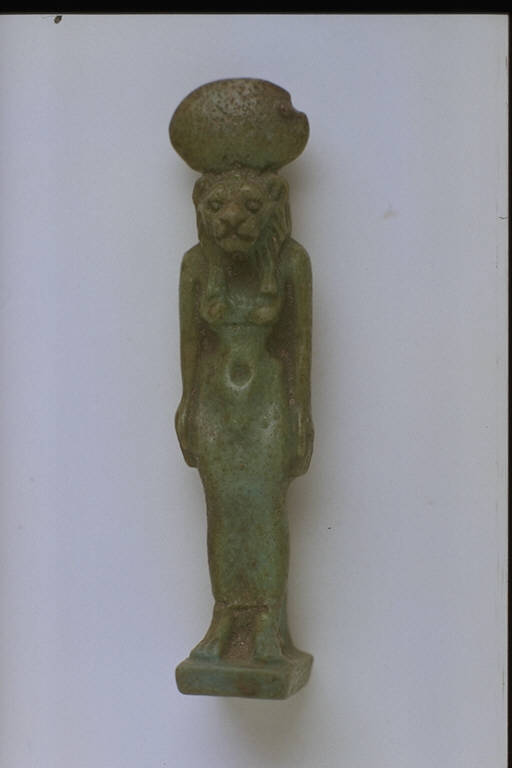 - NOTIZIE STORICO CRITICHE L'opera fa parte della raccolta egizia Giuseppe Acerbi (Castelgoffredo 1773 - 1846), costituita da reperti archeologici selezionati dall'erudito e scienziato naturalista mantovano - nominato nel 1826 Console Generale d'Austria in Egitto - tra Alessandria e Assuan, nella seconda metà degli anni Venti del XIX secolo. Entrata a far parte ufficialmente delle collezioni comunali di Mantova con il lascito di Agostino Zanelli, nipote ed unico erede dell'Acerbi, nel 1876, la raccolta ha conosciuto differenti collocazioni nel corso del tempo, fino all'attuale.\nL'amuleto rientra in un cospicuo gruppo di oggetti analoghi per tipologia e funzione (apotropaica/magica) e, tra questi, nella serie di amuleti raffiguranti divinità. Sekhmet - dea di Menfi, signora della pestilenza e della guerra - é rappresentata secondo l'usuale iconografia: con corpo umano e testa di leonessa diademata di disco solare. La figura è completata da una base rettangolare e da un pilastro dorsale.