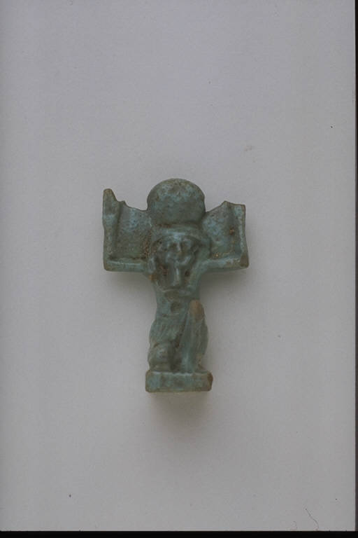 - NOTIZIE STORICO CRITICHE L'opera fa parte della raccolta egizia Giuseppe Acerbi (Castelgoffredo 1773 - 1846), costituita da reperti archeologici selezionati dall'erudito e scienziato naturalista mantovano - nominato nel 1826 Console Generale d'Austria in Egitto - tra Alessandria e Assuan, nella seconda metà degli anni Venti del XIX secolo. Entrata a far parte ufficialmente delle collezioni comunali di Mantova con il lascito di Agostino Zanelli, nipote ed unico erede dell'Acerbi, nel 1876, la raccolta ha conosciuto differenti collocazioni nel corso del tempo, fino all'attuale.\nL'amuleto rientra in un cospicuo gruppo di oggetti analoghi per tipologia e funzione (apotropaica/magica) e, tra questi, nella serie di amuleti raffiguranti divinità. Shu - dio dell'aria e dello spazio tra terra e cielo - é rappresentato come figura umana semi inginocchiata e braccia levate a sostenere la volta celeste: caratteri qui sottolineati da un modellato accurato. Il dio è diademato di piuma, grafema del proprio nome.