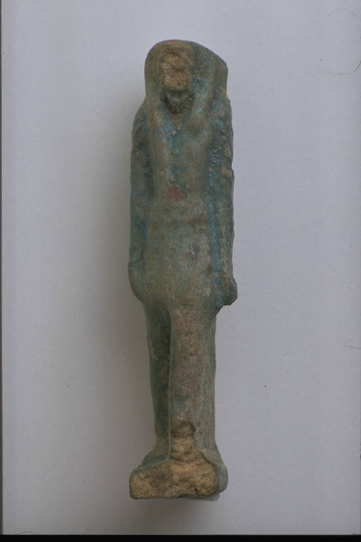 - NOTIZIE STORICO CRITICHE L'opera fa parte della raccolta egizia Giuseppe Acerbi (Castelgoffredo 1773 - 1846), costituita da reperti archeologici selezionati dall'erudito e scienziato naturalista mantovano - nominato nel 1826 Console Generale d'Austria in Egitto - tra Alessandria e Assuan, nella seconda metà degli anni Venti del XIX secolo. Entrata a far parte ufficialmente delle collezioni comunali di Mantova con il lascito di Agostino Zanelli, nipote ed unico erede dell'Acerbi, nel 1876, la raccolta ha conosciuto differenti collocazioni nel corso del tempo, fino all'attuale.\nL'amuleto rientra in un cospicuo gruppo di oggetti analoghi per tipologia e funzione (apotropaica/magica) e, tra questi, nella serie di amuleti raffiguranti divinità. Vi si può riconoscere, pur con difficoltà, il dio della scienza e della scrittura Thot, dal corpo umano e testa di Ibis: la frammentarietà del capo e la consunzione della superficie rendono difficile la lettura dell'amuleto.
