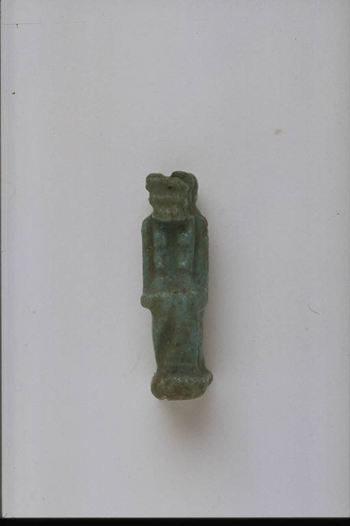 - NOTIZIE STORICO CRITICHE L'opera fa parte della raccolta egizia Giuseppe Acerbi (Castelgoffredo 1773 - 1846), costituita da reperti archeologici selezionati dall'erudito e scienziato naturalista mantovano - nominato nel 1826 Console Generale d'Austria in Egitto - tra Alessandria e Assuan, nella seconda metà degli anni Venti del XIX secolo. Entrata a far parte ufficialmente delle collezioni comunali di Mantova con il lascito di Agostino Zanelli, nipote ed unico erede dell'Acerbi, nel 1876, la raccolta ha conosciuto differenti collocazioni nel corso del tempo, fino all'attuale.\nL'amuleto rientra in un cospicuo gruppo di oggetti analoghi per tipologia e funzione (apotropaica/magica) e, tra questi, nella serie di amuleti raffiguranti divinità. La statuetta rappresenta Tueris, dea sotto forma di ippopotamo ritto sulle zampe posteriori, con braccia e mammelle femminili, protettrice delle puerpere. L'amuleto è modellato piuttosto sommariamente. Presenti un pilastro dorsale e una base rettangolare.