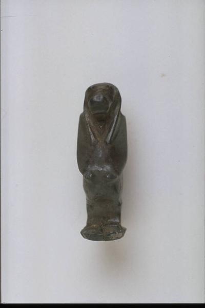 - NOTIZIE STORICO CRITICHE L'opera fa parte della raccolta egizia Giuseppe Acerbi (Castelgoffredo 1773 - 1846), costituita da reperti archeologici selezionati dall'erudito e scienziato naturalista mantovano - nominato nel 1826 Console Generale d'Austria in Egitto - tra Alessandria e Assuan, nella seconda metà degli anni Venti del XIX secolo. Entrata a far parte ufficialmente delle collezioni comunali di Mantova con il lascito di Agostino Zanelli, nipote ed unico erede dell'Acerbi, nel 1876, la raccolta ha conosciuto differenti collocazioni nel corso del tempo, fino all'attuale.\nL'amuleto rientra in un cospicuo gruppo di oggetti analoghi per tipologia e funzione (apotropaica/magica) e, tra questi, nella serie di amuleti raffiguranti divinità. La statuetta rappresenta Tueris, dea sotto forma di ippopotamo ritto sulle zampe posteriori, con braccia e mammelle femminili, protettrice delle puerpere. La lavorazione é accurata in ogni suo dettaglio.