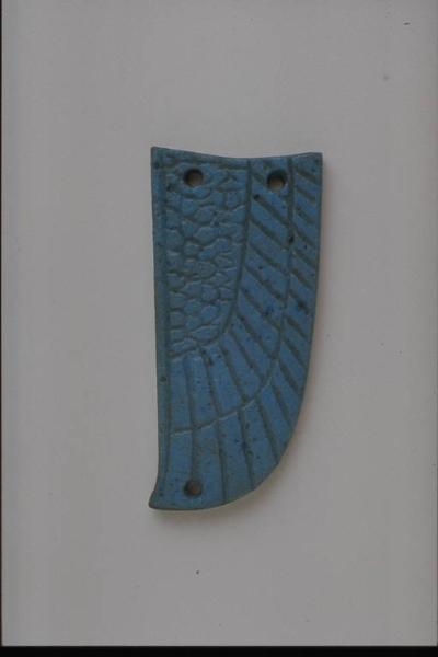 - NOTIZIE STORICO CRITICHE L'opera fa parte della raccolta egizia Giuseppe Acerbi (Castelgoffredo 1773 - 1846), costituita da reperti archeologici selezionati dall'erudito e scienziato naturalista mantovano - nominato nel 1826 Console Generale d'Austria in Egitto - tra Alessandria e Assuan, nella seconda metà degli anni Venti del XIX secolo. Entrata a far parte ufficialmente delle collezioni comunali di Mantova con il lascito di Agostino Zanelli, nipote ed unico erede dell'Acerbi, nel 1876, la raccolta ha conosciuto differenti collocazioni nel corso del tempo, fino all'attuale.\nL'amuleto rientra in un cospicuo gruppo di oggetti analoghi per tipologia e funzione (apotropaica/magica) e, tra questi, nella serie di amuleti raffiguranti divinità. L'ala di falco - in coppia con n.cat. 298 - appartiene alla divinità solare Horus e costituisce parte di un amuleto protettivo del defunto, fissato sul petto della mummia a partire dalla XXIII dinastia insieme allo scarabeo Kheperi. Le piume sono rese da fini incisioni.