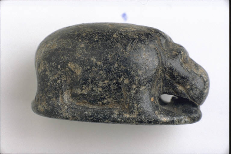 - NOTIZIE STORICO CRITICHE L'opera fa parte della raccolta egizia Giuseppe Acerbi (Castelgoffredo 1773 - 1846), costituita da reperti archeologici selezionati dall'erudito e scienziato naturalista mantovano - nominato nel 1826 Console Generale d'Austria in Egitto - tra Alessandria e Assuan, nella seconda metà degli anni Venti del XIX secolo. Entrata a far parte ufficialmente delle collezioni comunali di Mantova con il lascito di Agostino Zanelli, nipote ed unico erede dell'Acerbi, nel 1876, la raccolta ha conosciuto differenti collocazioni nel corso del tempo, fino all'attuale.\nL'amuleto rientra in un cospicuo gruppo di oggetti analoghi per tipologia e funzione (apotropaica/magica) e, tra questi, nella serie di 22 amuleti raffiguranti animali, la cui venerazione interessa l'Egitto dal periodo storico fino all'Età Romana. L'ippopotamo - sacro alla dea Tueris - fa corpo con la base dal contorno irregolare su cui poggia; il corpo dell'animale é definito solo nel volume. La superficie é levigata.