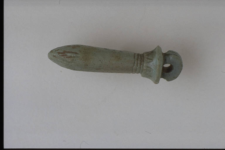 - NOTIZIE STORICO CRITICHE L'opera fa parte della raccolta egizia Giuseppe Acerbi (Castelgoffredo 1773 - 1846), costituita da reperti archeologici selezionati dall'erudito e scienziato naturalista mantovano - nominato nel 1826 Console Generale d'Austria in Egitto - tra Alessandria e Assuan, nella seconda metà degli anni Venti del XIX secolo. Entrata a far parte ufficialmente delle collezioni comunali di Mantova con il lascito di Agostino Zanelli, nipote ed unico erede dell'Acerbi, nel 1876, la raccolta ha conosciuto differenti collocazioni nel corso del tempo, fino all'attuale.\nL'amuleto rientra in un cospicuo gruppo di oggetti analoghi per tipologia e funzione (apotropaica/magica) e, tra questi, nella serie di 36 amuleti raffiguranti simboli. Il papiro con influorescenza aperta ("uad") rappresenta il caratteristico scettro delle dee e ha la proprietà di rendere fiorenti. Lo stelo di papiro è modellato a tutto tondo, con incisioni indicanti le foglioline alla base e i petali nella scampanatura.