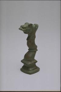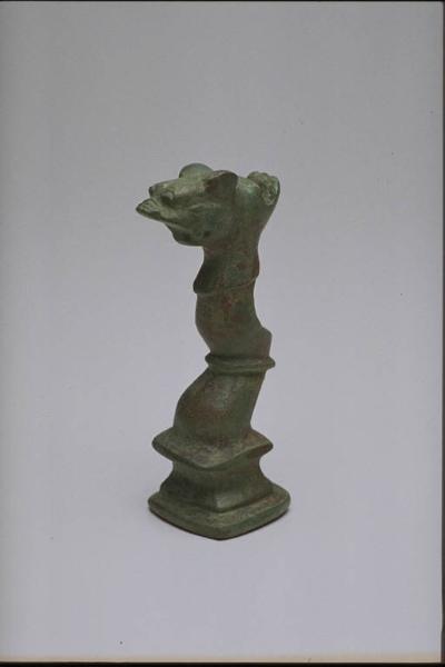 - NOTIZIE STORICO CRITICHE L'opera fa parte della raccolta egizia Giuseppe Acerbi (Castelgoffredo 1773 - 1846), costituita da reperti archeologici selezionati dall'erudito e scienziato naturalista mantovano - nominato nel 1826 Console Generale d'Austria in Egitto - tra Alessandria e Assuan, nella seconda metà degli anni Venti del XIX secolo. Entrata a far parte ufficialmente delle collezioni comunali di Mantova con il lascito di Agostino Zanelli, nipote ed unico erede dell'Acerbi, nel 1876, la raccolta ha conosciuto differenti collocazioni nel corso del tempo, fino all'attuale.\nL'oggetto rientra in un gruppo di alcuni elementi decorativi in bronzo per lo più destinati al complemento di arredi: si tratta, infatti, di un piede di supporto analogo al n.cat. 406, ma terminante con una testa leonina stilizzata in forma prettamente decorativa. Il pezzo é collocabile in età ellenistica.