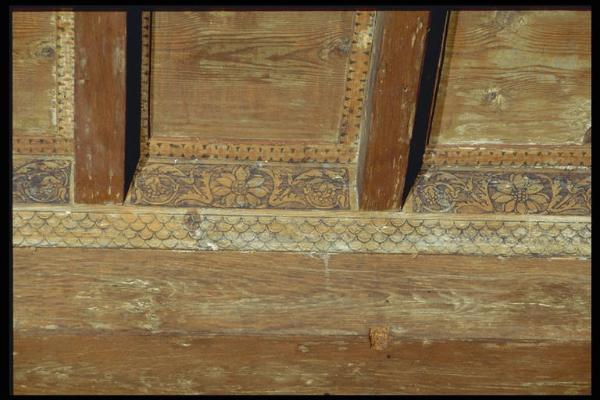 Soffitto diviso in settori quadrati. Le travi reggono resti di travetti dipinti