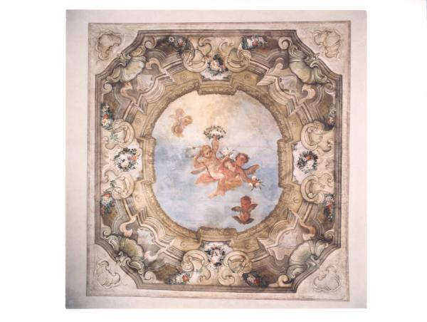 - NOTIZIE STORICO CRITICHE L'affresco era collocato in origine, nell'anticamera della prima alcova situata al piano superiore della villa. Si caratterizza per un motivo a quadratura che racchiude entro tondo centrale l'allegoria della Purezza, rappresentata da dei putti che sorreggono corone di fiori. Si noti la ripresa della grottesca romana e rinascimentale operata negli anni venti del Settecento alla corte sabauda da Filippo Minei, e poi diffusasi nei decenni seguenti sia in Lombardia sia in Piemonte.