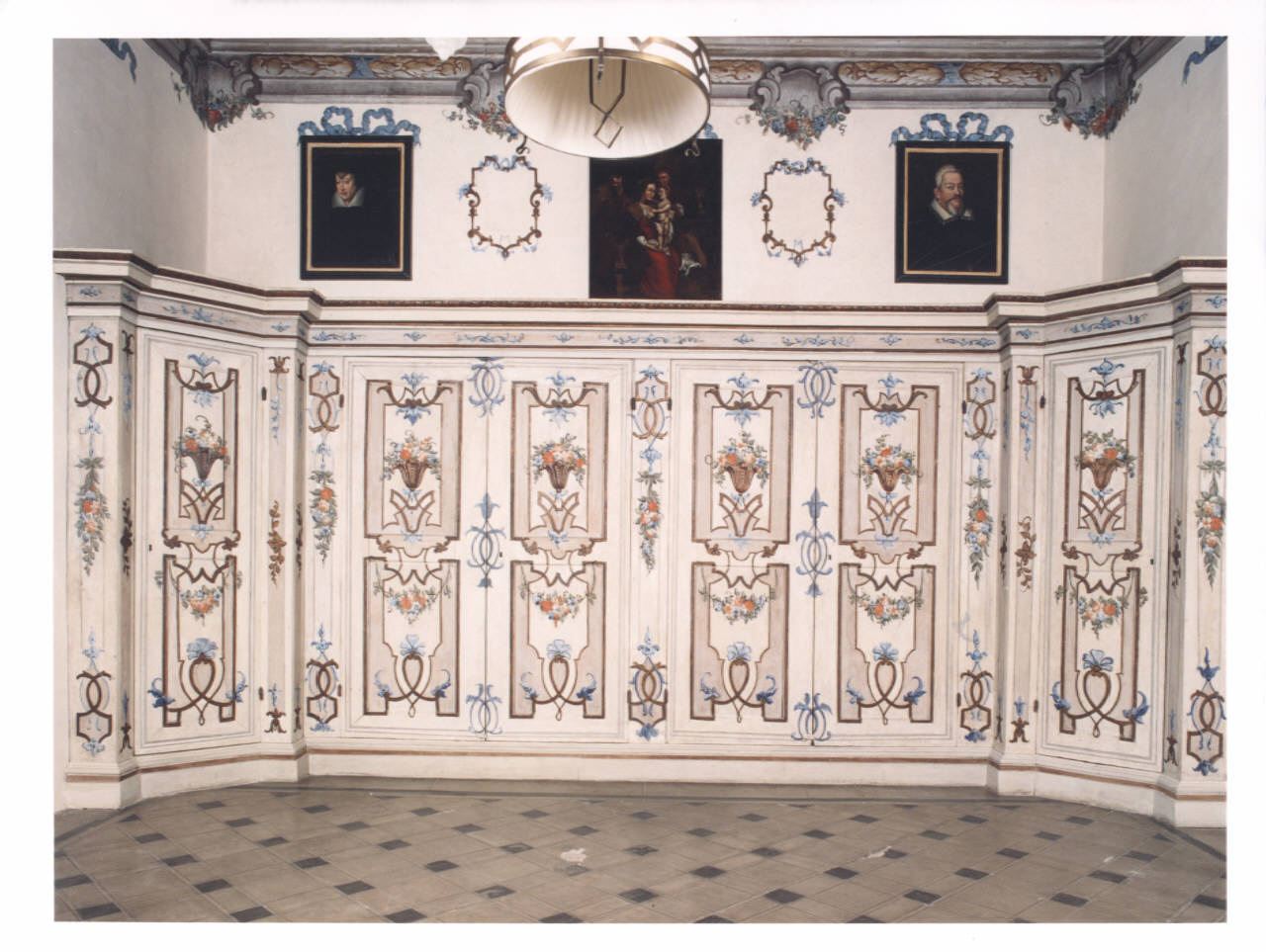 - NOTIZIE STORICO CRITICHE Le pareti presentano una decorazione unitaria. Su fondo bianco è impostata, nella parte superiore, subito sotto il soffitto ligneo, una cornice continua, dipinta, di colore blu/grigio con delle targhe poste ad intervalli regolari e decorate con mazzi di fiori nella parte inferiore. La parte restante delle pareti è arricchita con delle semplici cornici marroni con intrecci blu e dei nastri, sempre di colore blu, che in origine dovevano inquadrare dei dipinti. All'altezza del passaggio verso lo Studio si nota nel pavimento la data 1878, indicante il rifacimento dello stesso per volere di Cesare Richini.