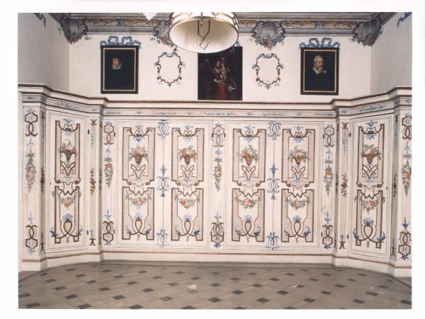 - NOTIZIE STORICO CRITICHE L'armadio, si caratterizza per la presenza di una cimasa intagliata e per le decorazioni floreali policrome. Ogni anta è decorata con due specchiature dipinte: in quella superiore si ha un vaso di fiori, in quella inferiore un serto di foglie con un fiore a cinque petali blu. Venne realizzato su misura nei primi decenni del Settecento, per occupare tutta la parete sinistra. All'interno è conservato il nucleo più recente della biblioteca della villa, con testi di medicina e geografia.