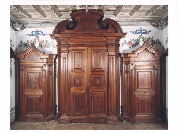 - NOTIZIE STORICO CRITICHE Armadio a muro realizzato appositamente per lo studio. A doppia anta, è interamente decorato con le sottili cornici in ocra e marrone che danno l'illusione dell'incisione. I fratelli Gattoni di Cabiaglio lavorarono alla villa come falegnami in diverse occasioni, a cominciare dal 1723.