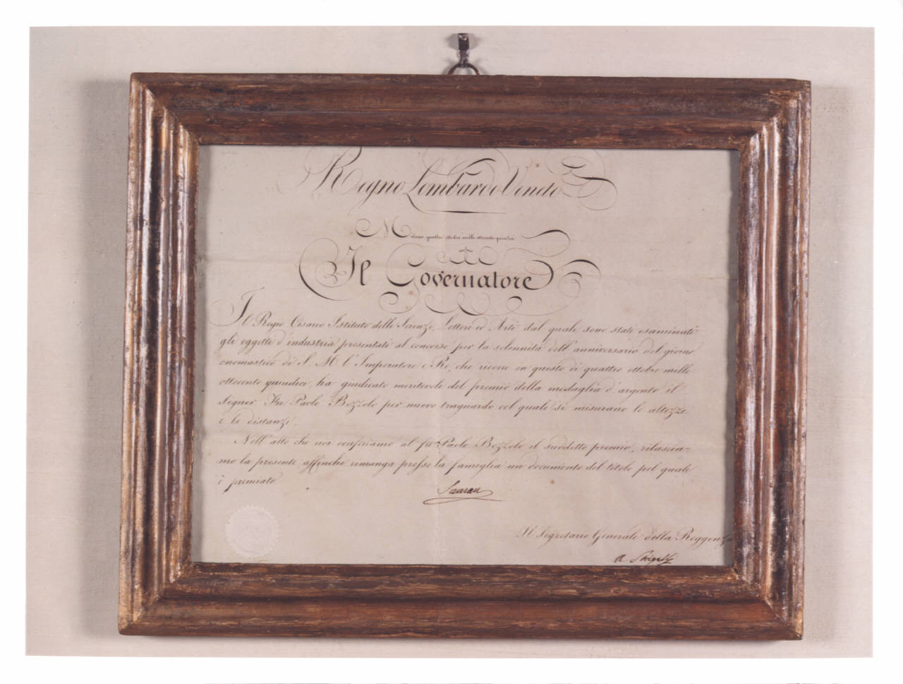 - NOTIZIE STORICO CRITICHE L'opera in oggetto è costituita dal riconoscimento conferito nel 1815 dal Governatore del Regno Lombardo-Veneto a l'ingegnere Paolo Bozzolo, nonno di Camillo.