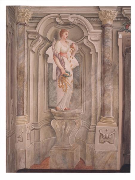 - NOTIZIE STORICO CRITICHE La galleria presenta una illusionistica struttura architettonica, dipinta, che inquadra sia le quattro porte sia le nicchie sostenute da sinuosi piedestalli in cui trovano posto le personificazioni delle Virtù. La decorazione è poi completata dalle volute sommitali con figure di genii e ninfe e con i decori geometrici negli sguanci delle finestre. Si noti una certa dolcezza dei contorni e la predilizione per colori chiari e sfumati, caratteristici anche per le sontuose quadrature tardobarocche, caratterizzate dagli innesti di serti floreali e di putti a monocromo giallo.