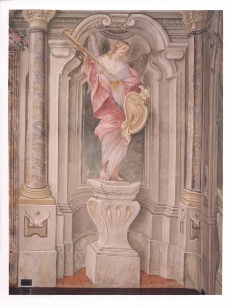 - NOTIZIE STORICO CRITICHE La galleria presenta una illusionistica struttura architettonica, dipinta, che inquadra sia le quattro porte sia le nicchie sostenute da sinuosi piedestalli in cui trovano posto le personificazioni delle Virtù. La decorazione è poi completata dalle volute sommitali con figure di genii e ninfe e con i decori geometrici negli sguanci delle finestre. Di solito è raffigurata accanto a personaggi illustri o, come in questo caso, all'emblema della famiglia. Si noti una certa dolcezza dei contorni e la predilizione per colori chiari e sfumati, caratteristici anche per le sontuose quadrature tardobarocche, caratterizzate dagli innesti di serti floreali e di putti a monocromo giallo.