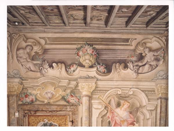 - NOTIZIE STORICO CRITICHE La galleria presenta una illusionistica struttura architettonica, dipinta, che inquadra sia le quattro porte sia le nicchie sostenute da sinuosi piedestalli in cui trovano posto le personificazioni delle Virtù. La decorazione è poi completata dalle volute sommitali con figure di genii e ninfe e con i decori geometrici negli sguanci delle finestre. La figura femminile raffigura la Temperanza. Nell'iconografia Medievale, il temperante era colui che si asteneva dal bere; questa virtù, quindi, è rappresentata da una giovane donna che versa un liquido da un'anfora in un'altra, mescolando il vino con l'acqua. La brocca alluderebbe, quindi, alla moderazione dei sensi. Si noti una certa dolcezza dei contorni e la predilizione per colori chiari e sfumati, caratteristici anche per le sontuose quadrature tardobarocche, caratterizzate dagli innesti di serti floreali e di putti a monocromo giallo.
