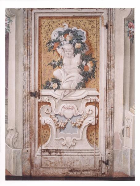- NOTIZIE STORICO CRITICHE La galleria presenta una illusionistica struttura architettonica, dipinta, che inquadra sia le quattro porte sia le nicchie sostenute da sinuosi piedestalli in cui trovano posto le personificazioni delle Virtù. La decorazione è poi completata dalle volute sommitali con figure di genii e ninfe e con i decori geometrici negli sguanci delle finestre. Le pareti sono intervallata da quattro porte che si innestano perfettamente all'intera decorazione. Ad anta unica raffigura, sul recto, un satiro barbuto che sorregge sopra il capo una conchiglia dalla quale parte un ricco serto di fiori policromi in cui spiccano rose, peonie e margherite. Poggia su un alto basamento decorato con volute e un tralcio di fiori nella parte centrale, questo trattato quasi a monocromo. Lo sfondo, di intenso colore giallo, è animato da una sottile decorazione floreale.