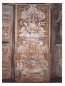 Porta ad anta unica raffigura, sul verso, un basamento architettonico piuttosto sottile nella parte inferiore su cui spicca un mascherone, mentre si apre in una struttura più ampia nella parte superiore, dove si ha la rappresentazione di un vaso da parete arricchito da fiori variopinti. Il fondo, di un intenso color giallo, è animato da sottili racemi e motivi nastriformi a tempera marrone.