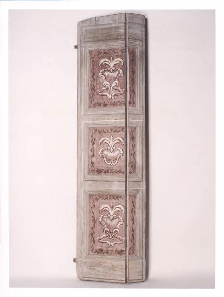 - NOTIZIE STORICO CRITICHE Gli scuri delle finestre della galleria sono tutti uguali, in modo tale da fornire omogeneità alla stanza stessa. Si caratterizzano per la divisione in tre specchiature che hanno una colorazione di base rosa intenso su cui si imposta una leggera cornice floreale nel bordo più esterno ed una decorazione con elementi geometrici centrale; quest'ultima è resa con rialzi in bianco e profilatura in marrone scuro.