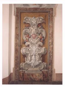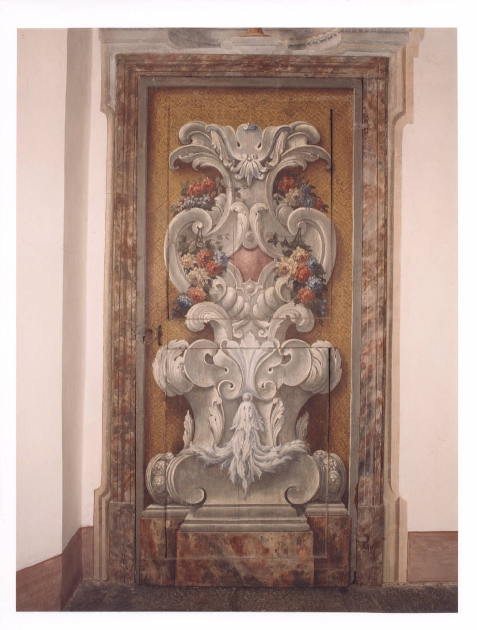 Porta lignea ad anta unica raffigura, sul verso, un basamento architettonico arricchito da elementi floreali e da una cornice affrescata nella parte superiore, una sorta di continuazione illusionistica della porta stessa.